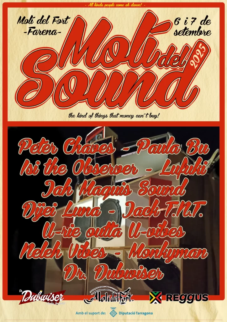 Prepara’t per a una experiència musical única els dies 6 i 7 de setembre al Molí del Fort. Sota el lema "the kind of things that money can’t buy", aquesta nova edició del Moli del Sound ens convida a connectar amb l'essència del dub i el reggae en un entorn natural incomparable. Enguany comptem amb un cartell de luxe que inclou artistes com Peter Chaves, Paula Bu, Isi the Observer, Lufuki, Jah Maquis Sound, Djiei Luna, Jack T.N.T., U-rie outta U-vibes, Neleh Vibes, Monkyman i la sessió especial de Dr. Dubwiser. Amb el suport de la Diputació de Tarragona i la col·laboració de Reggus, t'esperem per viure dos dies de ball, comunitat i bones vibracions. All kinda people come ah dance!